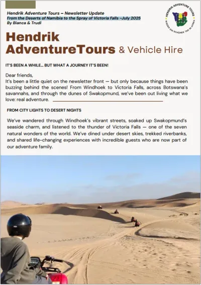 It’s been a little quiet on the newsletter front — but only because things have been buzzing behind the scenes! From Windhoek to Victoria Falls, across Botswana’s wild heart, and through the dunes of Swakopmund, we’ve been out living what we love: real adventure.