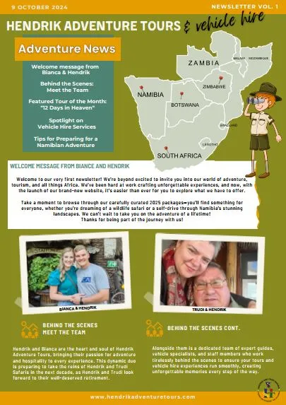 We couldn’t be happier with the successful launch of Hendrik Adventure Tours & Vehicle Hire and how our first tour is underway. Take a tour through our website to discover all the exciting destinations and experiences we offer. Be sure to follow us on Facebook to stay updated on our latest adventures, special offers, and behind-the-scenes moments that will inspire your next journey.